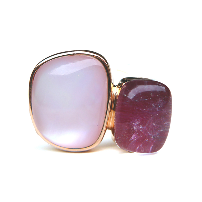 Briljant (0.02), Roze kwarts, Parelmoer, Bergkristal, Robijn, Parelmoer |